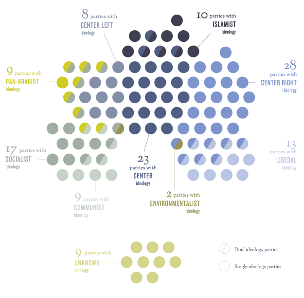Read more about one grassroots communityTunisia’s political ecosystem has been quickly populated by an explosion of political parties, with platforms and ideologies as diverse as Tunisia itself. The below graphic charts the relative distribution of these parties across the political spectrum. This uncharted political environment has resulted in a corresponding demand for reliable, independent media resources to help citizens make informed political decisions.